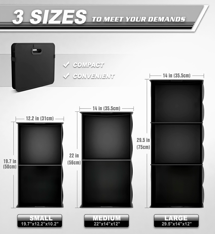 Tato přenosná skládací vodotěsná taška do kufru o třech velikostech pro jakékoli auto je k dispozici ve 3 velikostech, z nichž jedna je 75 x 35,5 x 30,5 cm, váží 1,45 kg a obsahuje 5 kusů v jedné krabici. Používá vysoce kvalitní látku Oxford s PP deskou nebo MDF deskou a uvnitř používá podšívku 210D, která je robustní a odolná a má dobré vodotěsné vlastnosti. Skládací design umožňuje snadné složení úložné tašky, když se nepoužívá, šetří místo a snadno se přenáší. Ať už se jedná o sedan, SUV nebo jiné modely, lze jej snadno přizpůsobit a je ideální volbou pro uložení a organizaci interiéru.
